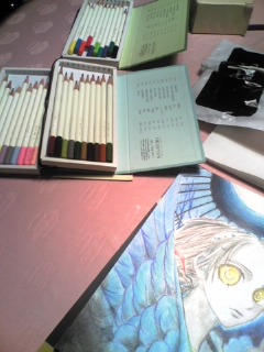 今回は全部油彩の色鉛筆にしました。 水彩が思った以上に自分好みの仕上がりにならないとわかり、途中で変更しました。 あとでスキャンして(学校で)画廊にでもUPしたいと思います。 ←使用した画材はデリーターのイラストボードと、色辞典の1巻。 実際は肌が真っ白なので。 (というか、赤みのある色はほとんど使わなかった) 白熱電球の下で撮影したからでせう。 つぎはもっと精密な絵をかきたいなあ。 正直、今回の絵もコミック的には人気のあるような雰囲気ではない気がしています。イラストレーションであるのに中途半端に西洋絵画風というか・・・ カラーインクとかコッピクマーカーで仕上げる軽めなイラストの方が人気があるのかなああ。。。。? ここんとこはまだ模索中です。 それでいいのだとも思うけれど。 いろんな画材を使いこなせるようになれたらたのしいだろうし。 次はカラーインクで主線いれるぞ★ PR 2007.11.02 Fri 09:42:31